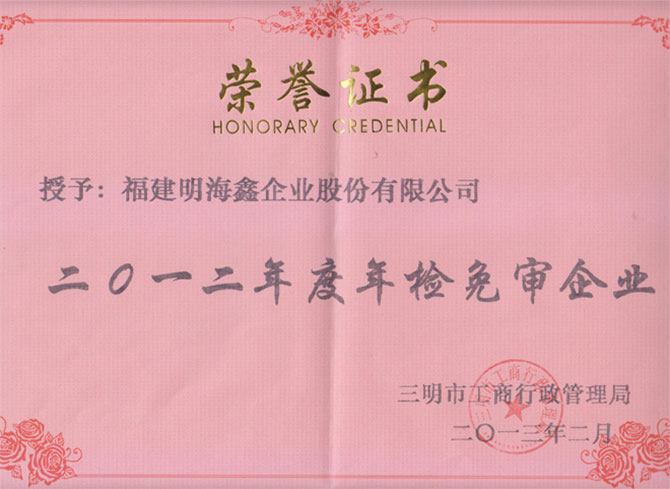 2013年二月份,福建明海鑫企業(yè)股份有限公司被三明市工商行政管理局授予二0一二年度年檢免審企業(yè)。